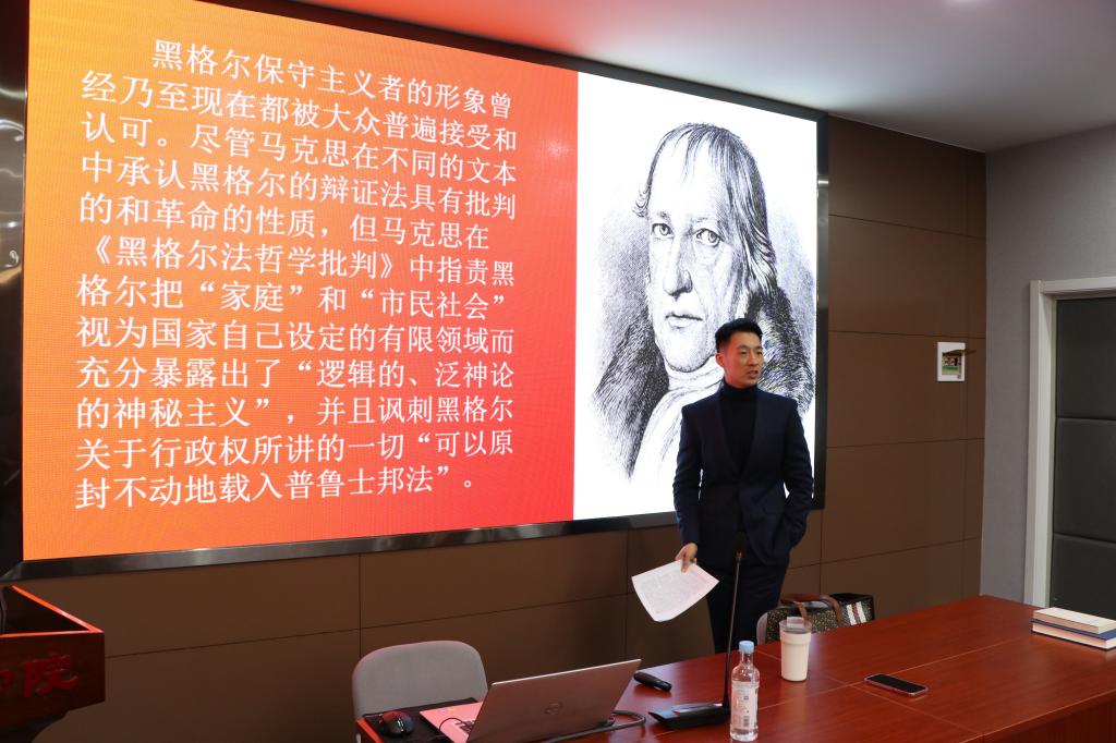 报告会伊始,胡业成向在场的学生们讲解了马克思对黑格尔政治哲学之“逻辑泛神论”本质的揭露,并回顾了黑格尔如何从君主立宪制的拥护者被逐渐解读为普鲁士的官方哲学家。他指出从20世纪70年代开始,随着国际学界对黑格尔哲学的重新关注,把黑格尔解释为保守主义者的传统观点不断遭到挑战。近年来,甚至有的学者试图阐释黑格尔与自由主义之间存在着隐蔽的密切关联,当代自由主义者和共和主义者不断从黑格尔的政治哲学中获取资源。胡业成指出,把黑格尔解释为保守主义者或自由主义者都是错误的,因为这种二元对立的判断模式既忽视了黑格尔所处时代的历史背景和政治局势,也无法帮助我们准确把握黑格尔政治哲学的复杂性。他指出,我们应当超越这种非此即彼的知性思维方式,并努力使我们的抽象知性发展为思辨理性。