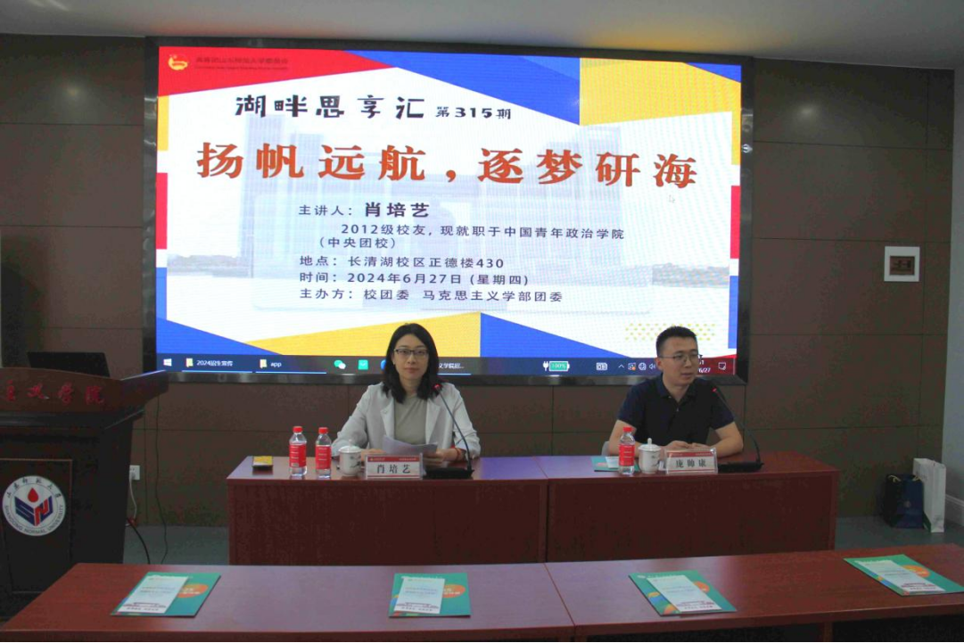 6月27日下午,由校团委、马克思主义学部团委共同主办的湖畔思享汇之“扬帆远航,逐梦研海”宣讲会于正德楼430教室举行。会议由中国青年政治学院中共党史与青运史系教师肖培艺主讲,研究生辅导员庞帅康主持。2021级、2022级、2023级同学积极与会。