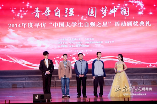 3月21日下午,由共青团中央、全国学联主办,中国青年报社、中国高校传媒联盟承办,新东方教育科技集团协办的2014年度寻访“中国大学生自强之星”活动颁奖典礼在东南大学九龙湖校区焦廷标馆剧场举行。团中央书记处书记傅振邦、新东方教育科技集团董事长俞敏洪、《中国青年报》副总编辑马年华、共青团江苏省委书记万闻华等领导嘉宾出席了活动。2014年度“中国大学生自强之星标兵”、我院2013级博士研究生张九童应邀参加颁奖典礼并与团中央领导同志座谈。