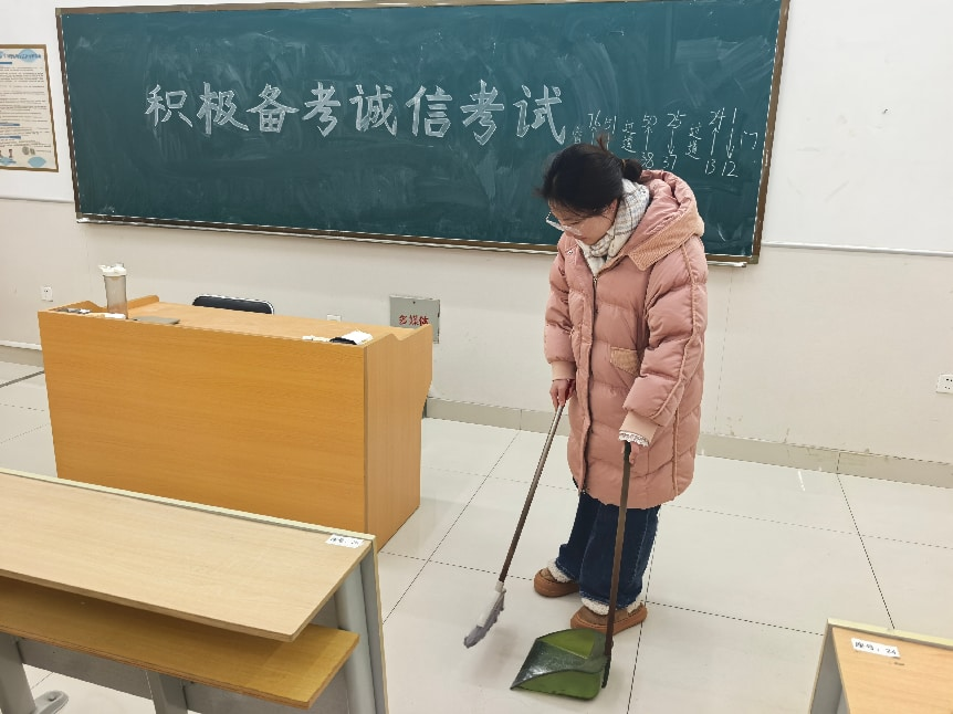 考场布置工作提前规划,制定工作方案,明确任务分工;对教室进行设施全面复检与深度清理,有序推进考场整理、考号张贴、座位号标示、电子时钟校准等工作;及时下发考试考场安排通知,确保师生清晰知晓考试相关事宜;对考场内的桌椅、地面、讲台等区域进行全方位清扫,细致清理卫生死角,以整洁明净的环境为考生营造舒适的考试氛围。各考场的黑板上均以醒目字体书写“积极备考,诚信考试”的诚信标语,并在学院一楼大厅播放诚信考试倡议。师生协作下,本次考场布置工作高效完成,为期末考试的顺利进行做好充分准备。