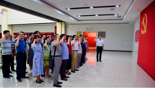 在三楼特别仪式区,全体党员在党旗前庄严宣誓,重温入党誓词。大家纷纷表示,要在今后的工作中继续锤炼党性、修养品格,练就善于担当的真功夫,不忘初心、牢记使命,以自身行动为学院和学校事业发展贡献力量。活动结束后,学院教工党员与基地工作人员进行了座谈。