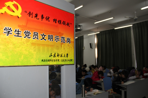 为将创先争优活动不断引向深入,在校园中大力倡导崇尚文明、弘扬正气的社会风尚,引导广大青年学生从自我做起,争做文明学生、争创文明考场,促进大学生诚信素质和校园文明程度的不断提高,政治与国际关系学院·马克思主义学院“‘创先争优,楷模领航’——学生党员文明示范岗”日前走进了期末考试的考场。