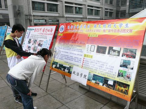 学院精心设计制作了推广普通话宣传教育活动主题展板,展板以图文并茂的形式生动形象地介绍了学院开展推普活动的情况,充分展示推普活动所取得的成效,并向全校同学发出了“说标准的普通话 做文明的大学生”的倡议书。“普通话沟通人与人;普通话连结心与心” “让青春与普及的语言作伴,让知识与文明的语言携手” “学习普通话,行动在大家;推广普通话,依靠你我他”句句宣传口号都得到同学们的共鸣和赞同。同学们纷纷表示一定要积极行动起来,从我做起,使普通话成为学习生活的主要交流工具,写规范字,做文明人,力争为城市形象的塑造、城市文明程度的提高尽一份力量。
